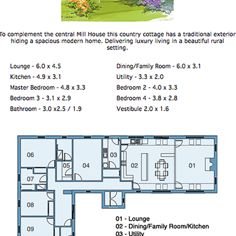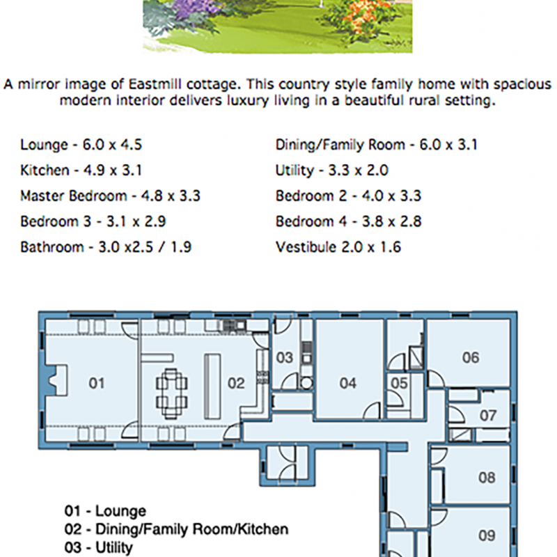 The four-bedroom homes boast views across the Nairnshire countryside and benefit from the tranquility of its rural location. Individually designed and based on the theme of a farmhouse courtyard leading up to the properties, the open driveway represents the courtyard leading up to Mill House as the main "farmhouse" with East and West Mill Cottage flanking the "farmhouse" at either side.